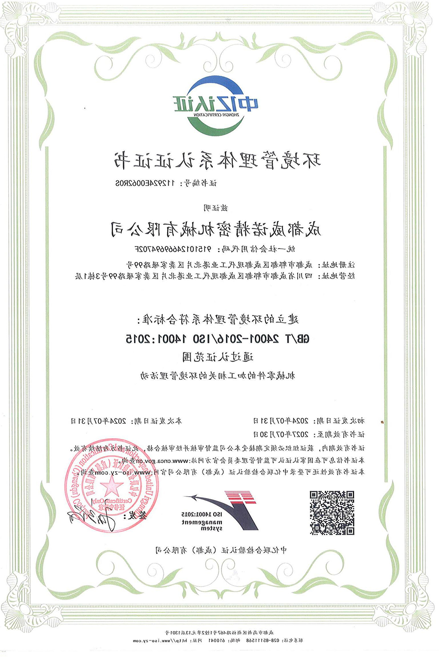 环境管理体系认证证书